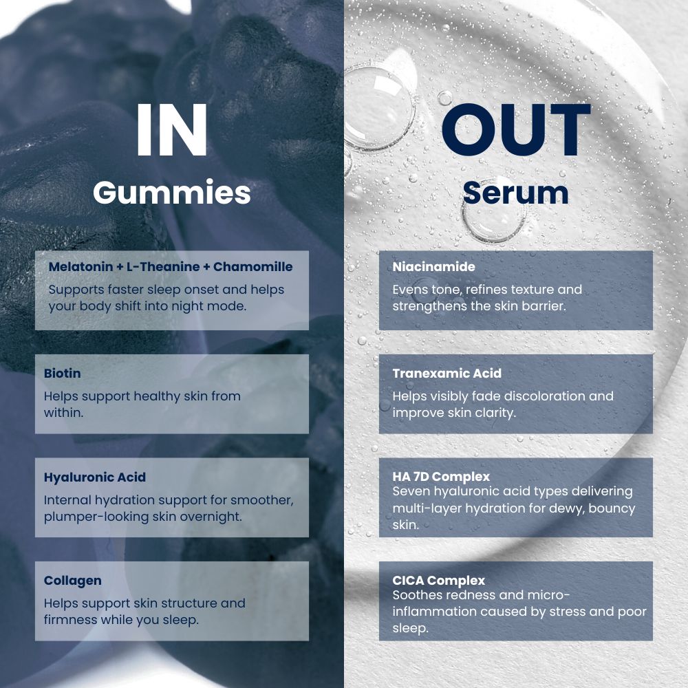 Absolutely. The system was designed as a single Inside + Outside ritual. Gummies support sleep + internal glow, while the serum repairs your skin barrier and hydrates through the night.
