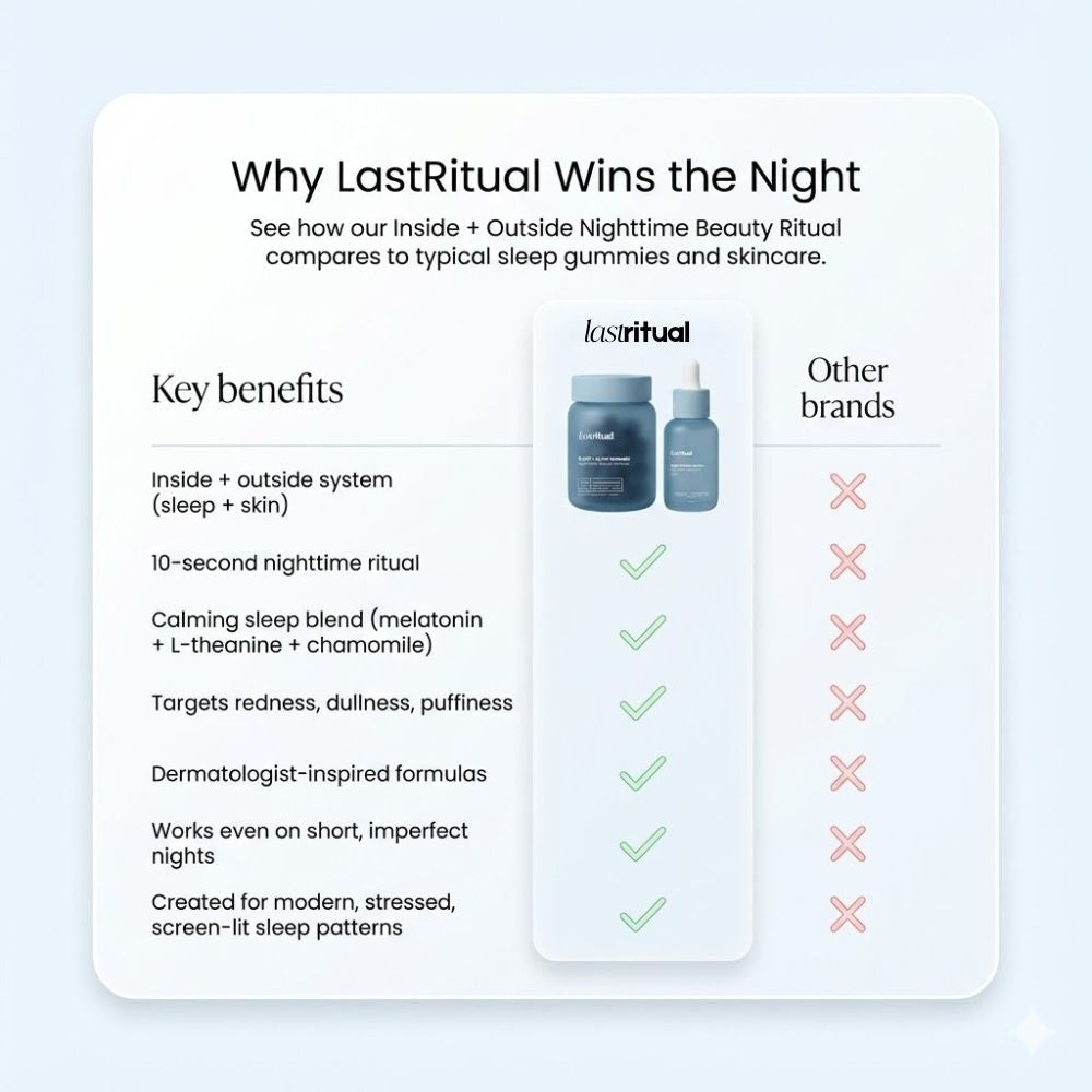LastRitual helps you sleep deeper so your nutrients work from the inside — while your serum restores your skin from the outside, for a brighter glow by morning.