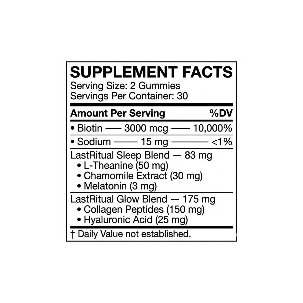 No. LastRitual uses an optimized 3 mg dose paired with L-Theanine and chamomile for a calm transition into sleep—without the heavy 'melatonin hangover' common in high-dose gummies.